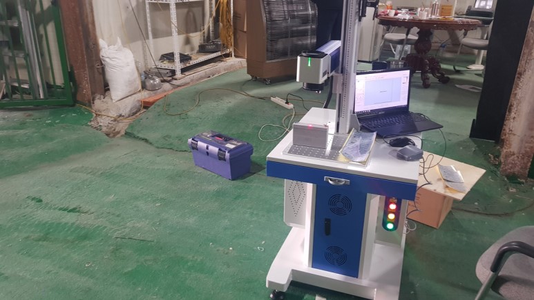 파이버 금속 마킹기 작업 테이블 위에 작업 샘플을 올려놓고 테스트를 진행해드렸습니다