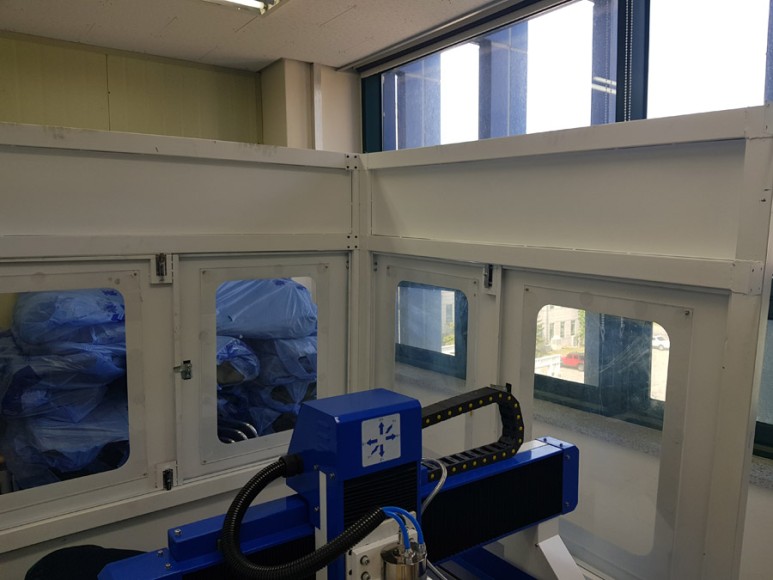 이번에 납품온 업체에서는 작업중 생기는 소음과 분진들 때문에 CNC조각기의 케이스를 같이 의뢰 주셔서 제작후 설치까지 해드리는 모습입니다.