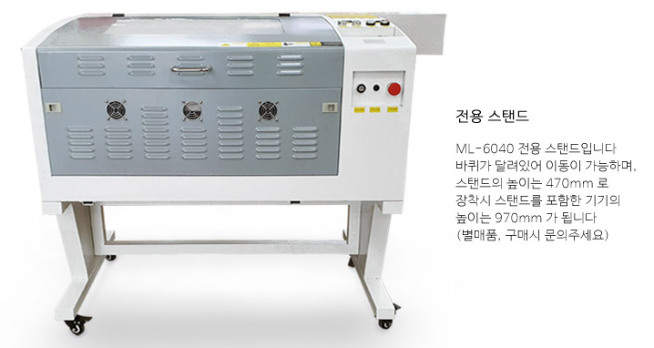스탠드의 높이는 470mm로 레이저커팅기에 장착시 스탠드를 포함한 기기의 높이는 970mm가 됩니다.