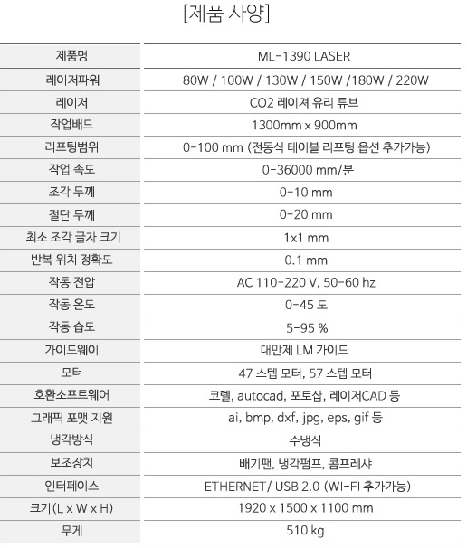 ML-1390은 1300*900 가공영역의 레이저커팅기 로 고사양의 파츠를 사용하여