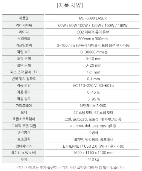 ML-6090 은 600*900 가공영역의 레이저커팅기 로 고사양의 파츠를 사용하여