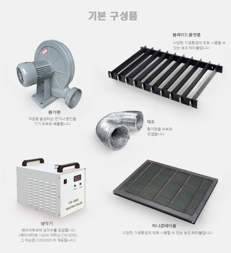 레이저 튜브와 파워서플라이 같은 핵심 부품들은 물론 커플링, 리미트센서 등의 각종 부품들도