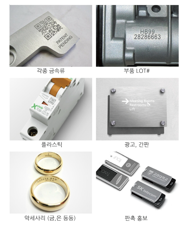 로고 및 글자 등을 마킹하거나 각종 부품류, 기타 생산물에 로트 넘버를 새기는데도 사용되며
