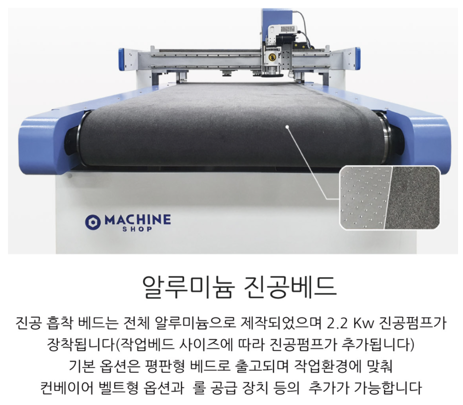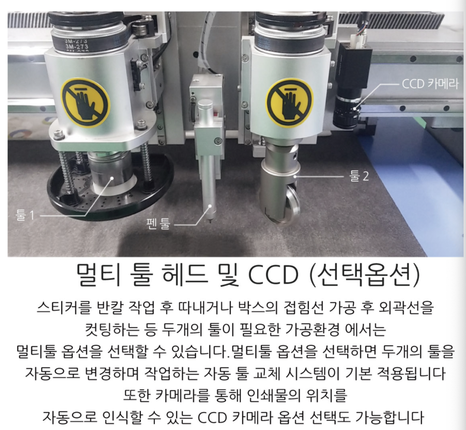 600x900mm 가공 영역으로 제작되었으며 진동 커팅 툴, V 컷 툴, 키스컷 툴 등등 다양한 툴을
