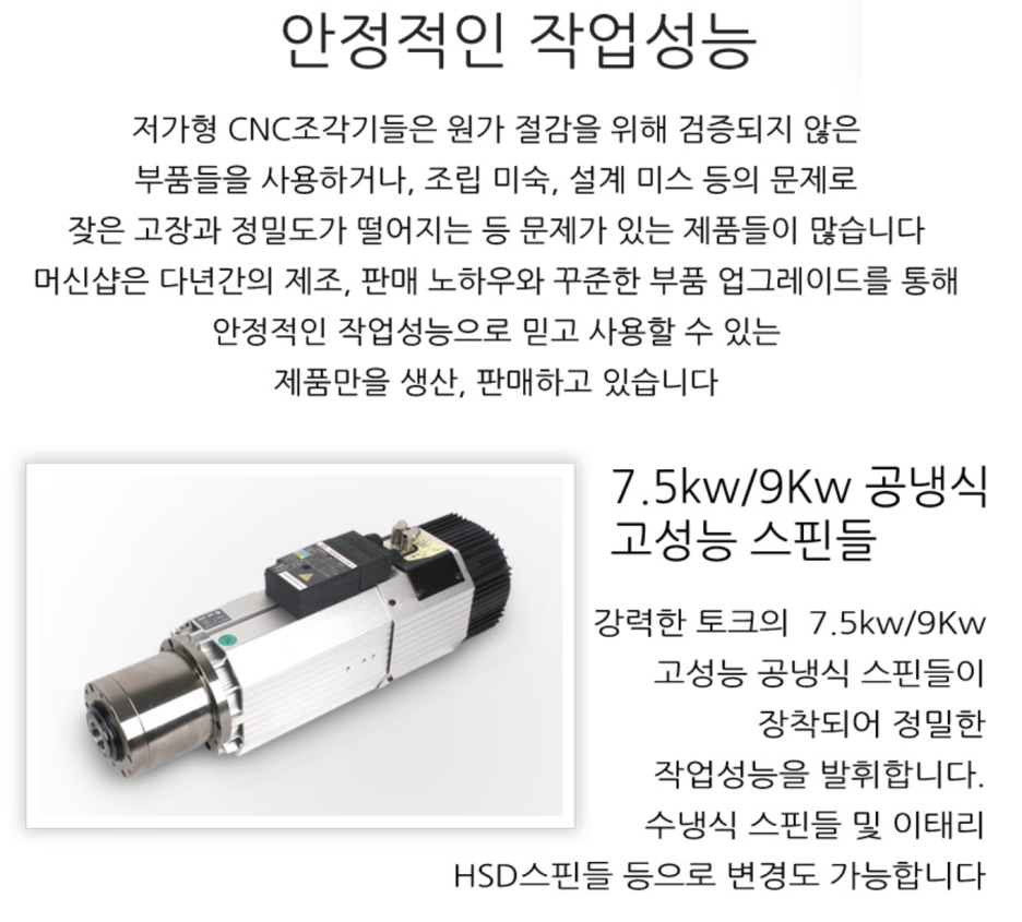 고성능 7.5KW / 9KW 공냉식 스핀들 모터와 X, Y, Z 축 모두 대만제 LM GUIDE로 제작,